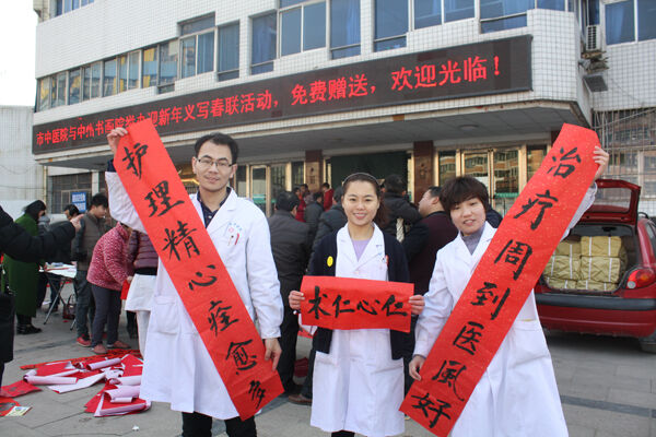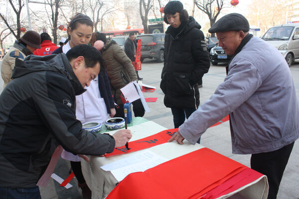 2月3日上午,商丘市中医院联合市中州书画院举办了第二届迎新春送春联活动。中州书画院的8名书法家们在医院门诊楼前冒着寒风挥毫泼墨,为市民义务写春联,围观市民称赞不已。