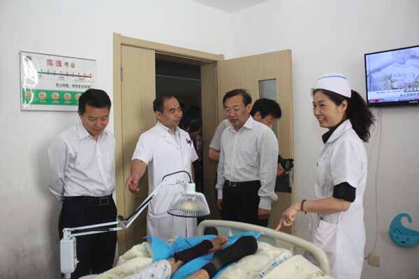 杨主任一行先后来到了内一科、骨一科及血液净化科等科室,与医务人员亲切交谈,并参观科室内中医特色治疗室,了解其中医特色疗法,同时看望部分诊疗中的病人。市中医院院长朱伯健向大家介绍了医院管理、医疗设施、队伍建设及被列入“商丘市十件实事”商丘市中医院门诊楼扩建项目的进行情况。视察中,杨主任等对市中医院贯彻落实《河南省中医条例》情况和中医药事业发展取得的成绩给予了肯定,希望市中医院进一步贯彻落实好条例,更好地为推进商丘市中医药事业的发展做贡献。