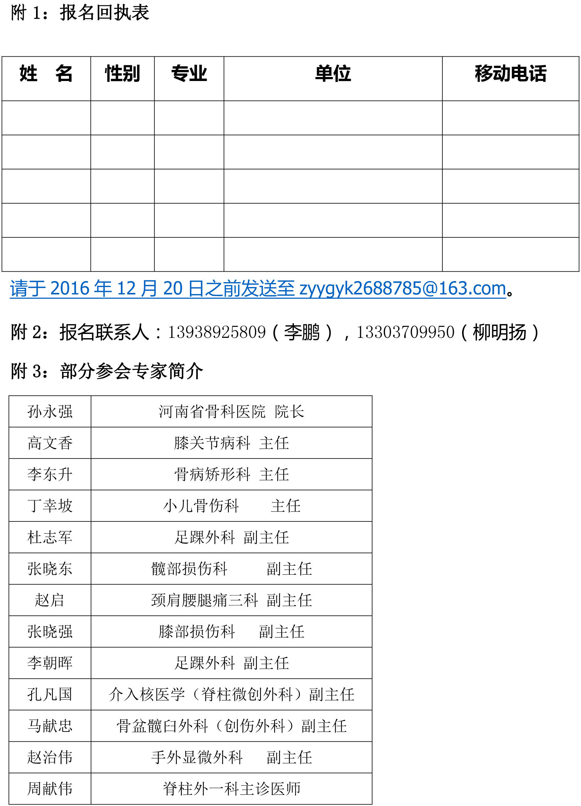 3、本次大会讨论范围涵盖创伤、矫形、骨病、显微等热门领域,若您有兴趣参与,请于2016年12月20日之前通过网络或电话预约报名,若因条件所限无法提前预约者可于会议当天8:00-9:00现场登记报名。