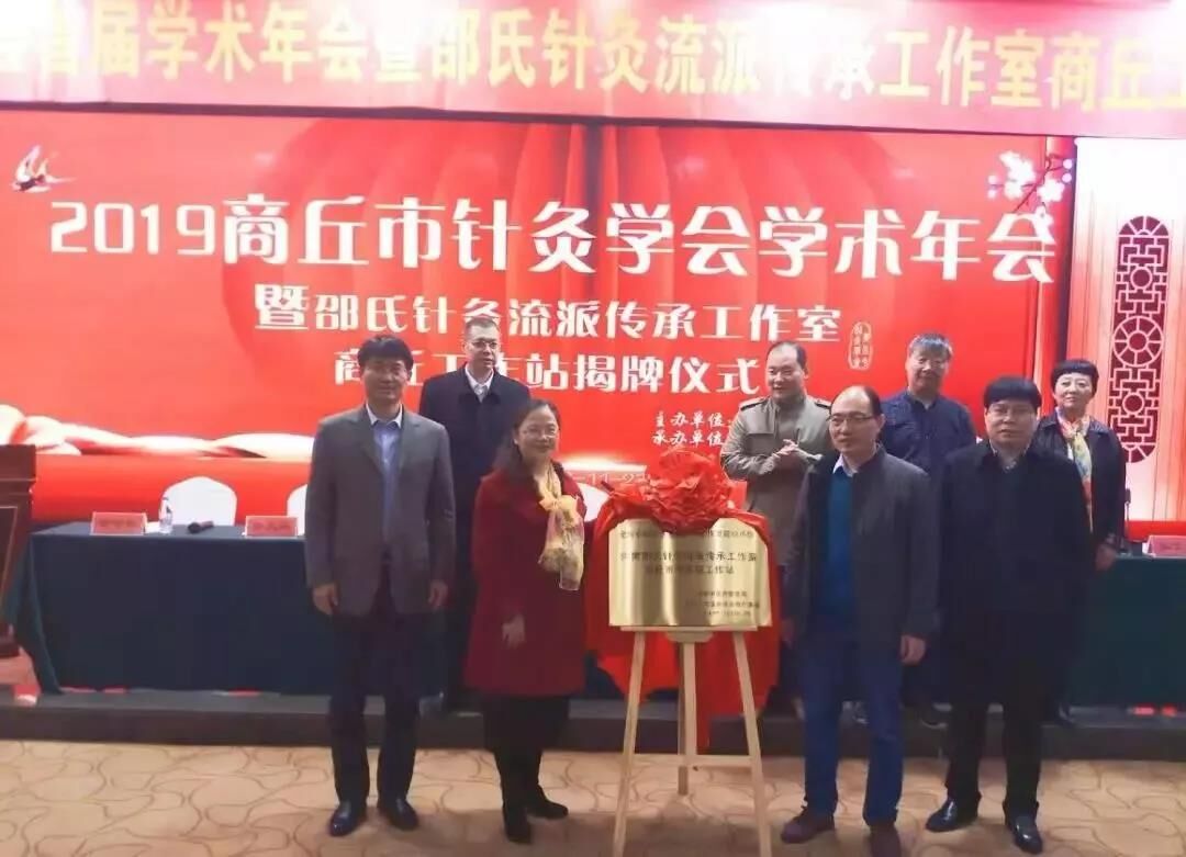 河南中医药大学邵素菊教授,河南中医药大学胡斌副院长,商丘市中医院李德怀院长和、张士兰副院长,商丘市针灸学会徐守臣会长共同为“河南邵氏针灸流派传承工作室商丘市中医院工作站”揭牌。